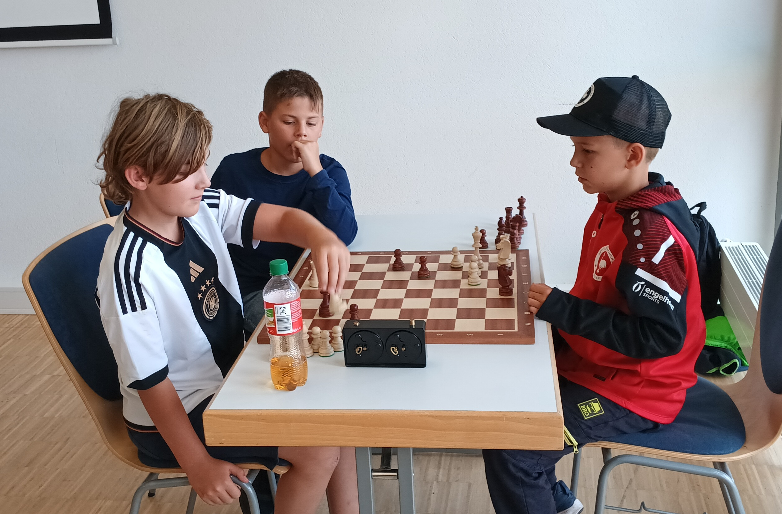 Zehn Teilnehmer wollten die Gelegenheit nutzen, um einmal ein kleines Schachturnier zu spielen. In neun Runden musste dabei jeder einmal gegen jeden antreten. Damit das Ganze auch in einem sinnvollen Zeitrahmen über die Bühne gehen konnte, kamen Schachuhren zum Einsatz. Dies stellte überhaupt kein Hindernis dar, denn entweder kannten sich die Kinder bereits damit aus oder sie fanden sich problemlos in das Spiel mit begrenzter Bedenkzeit ein. Am Ende gab es mit Timo Hauser einen eindeutigen und verdienten Sieger, denn er gewann einfach alle Partien. Den zweiten Platz teilten sich Nikita Landmann und Marvin Weigert.